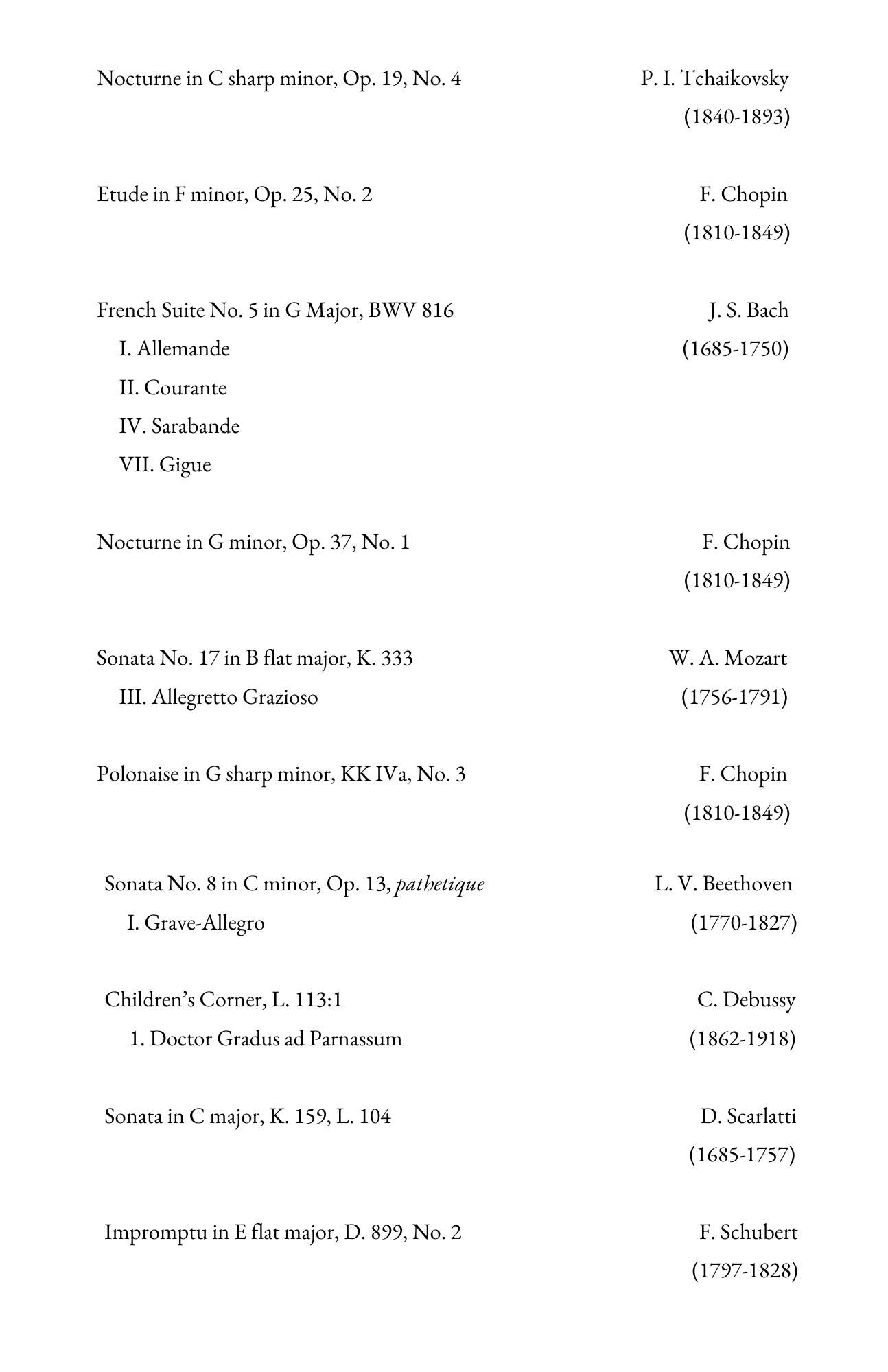 Our students will be performing their latest repertoire featuring works by Bach, Beethoven, Chopin, Debussy, Liszt, Mendelssohn, Mozart and Scarlatti.